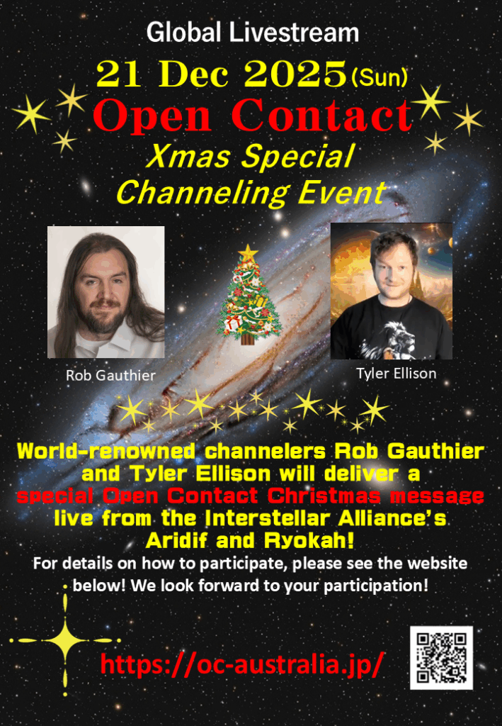 🎄Two world-renowned channelers, Rob Gautier and Tyler Ellison, will deliver a live Christmas Special Message from the Interstellar Alliance beings Aridif and Ryokah, sharing insights on Ascension and Open Contact!
